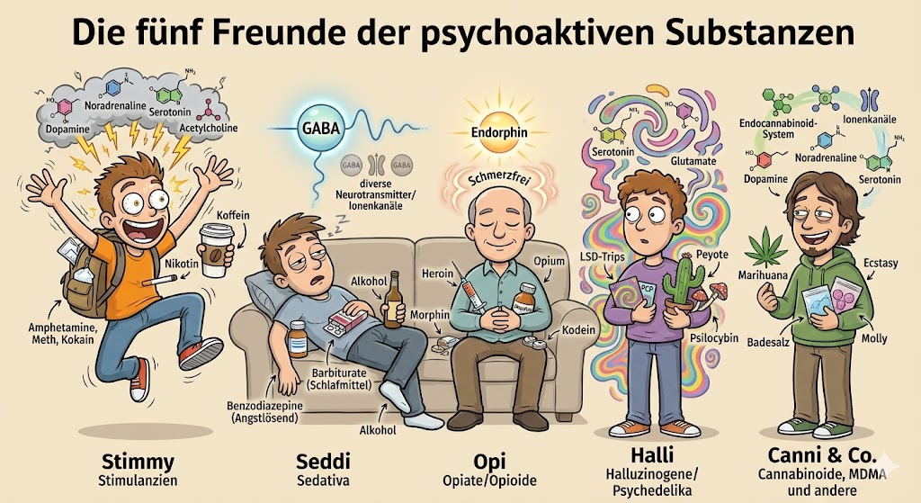 Das große Finale war dann der Auftritt der fünf Freunde der psychoaktiven Substanzen, die den Blumates einprägsam erläuterten, welche Substanzen sie mitführen, welche psychologische Wirkung diese hätten und auf welche Neurotransmitersysteme diese einwirkten.