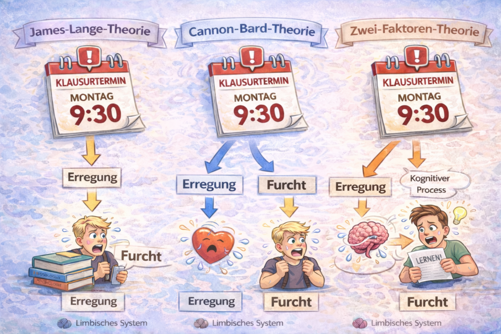 Dabei sind Reiz, Emotion und Erregung zu unterschieden und je nach Theorie einzuorden. Dies wurde von PD DLF gekonnt, anhand der James-Lange-Theorie, der Cannon-Bard-Theorie sowie der Zwei-Faktoren-Theorie variiert.