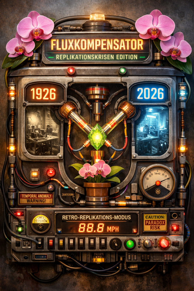 Die Blumates, die regelmäßig im House of Orchideen mitgefeiert haben, erinnern sich bestimmt noch an den Fluxkompensator, der im Rahmen von ‚Happy introduction into psychologie‘ im House of Orchideen installiert wurde und die Replikation aktueller Studien rückwirkend ins Jahr 1926 ermöglichte.