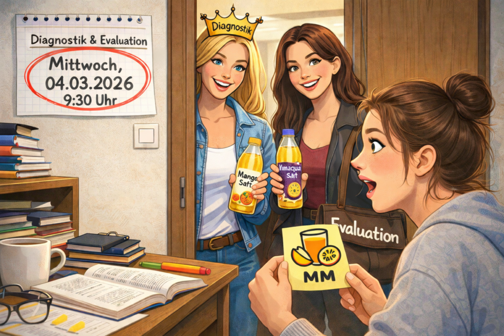Alles in allem fehlten im Wintersemester anscheinend einige Wochen, um auch die Themen aus der Diagnostik und der Evaluation in einer Tiefe zu bearbeiten, wie einige Blumates und vermutlich auch die Prüfenden es sich gewünscht hätten!