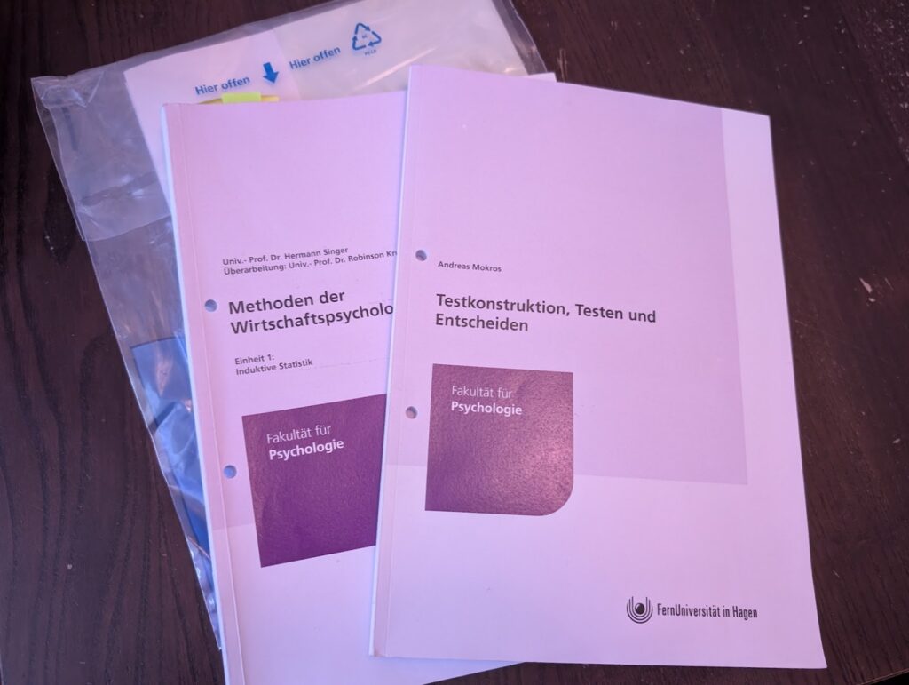 Wie zuvor berichtet: das Ende der Papierskripte ist gekommen. Es gibt von mir noch ein letztes originalverpacktes Skript zum Modul ‚Methoden der Wirtschaftspsychologie‘, welches mir seinerzeit von der Reklamationsstelle als Ersatz geliefert wurde, da das ursprüngliche Skript mehr als zwei Wochen auf dem Postweg verschollen war, aber schließlich auftauchte.